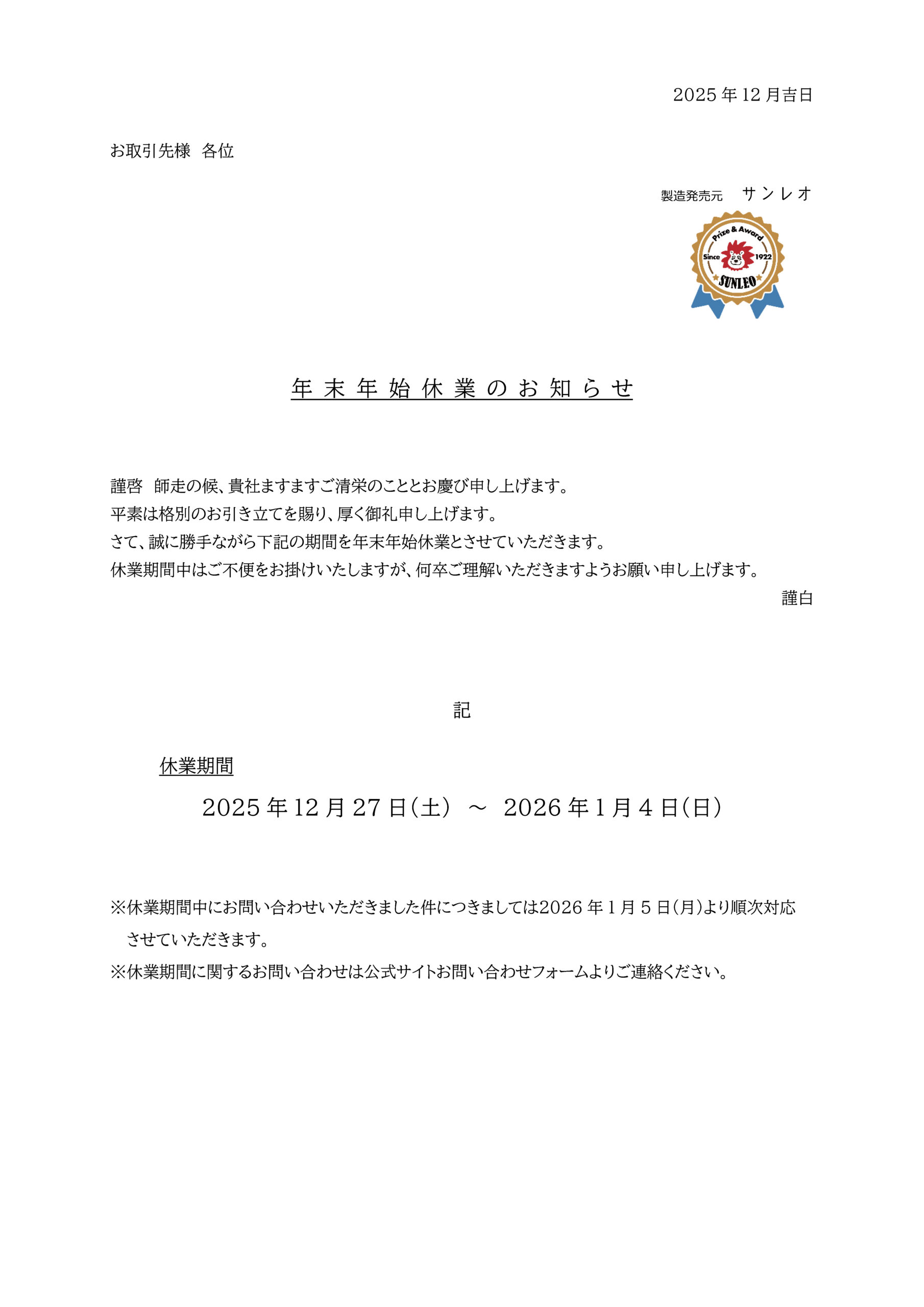 さて、誠に勝手ながら下記の期間を年末年始休業とさせていただきます。